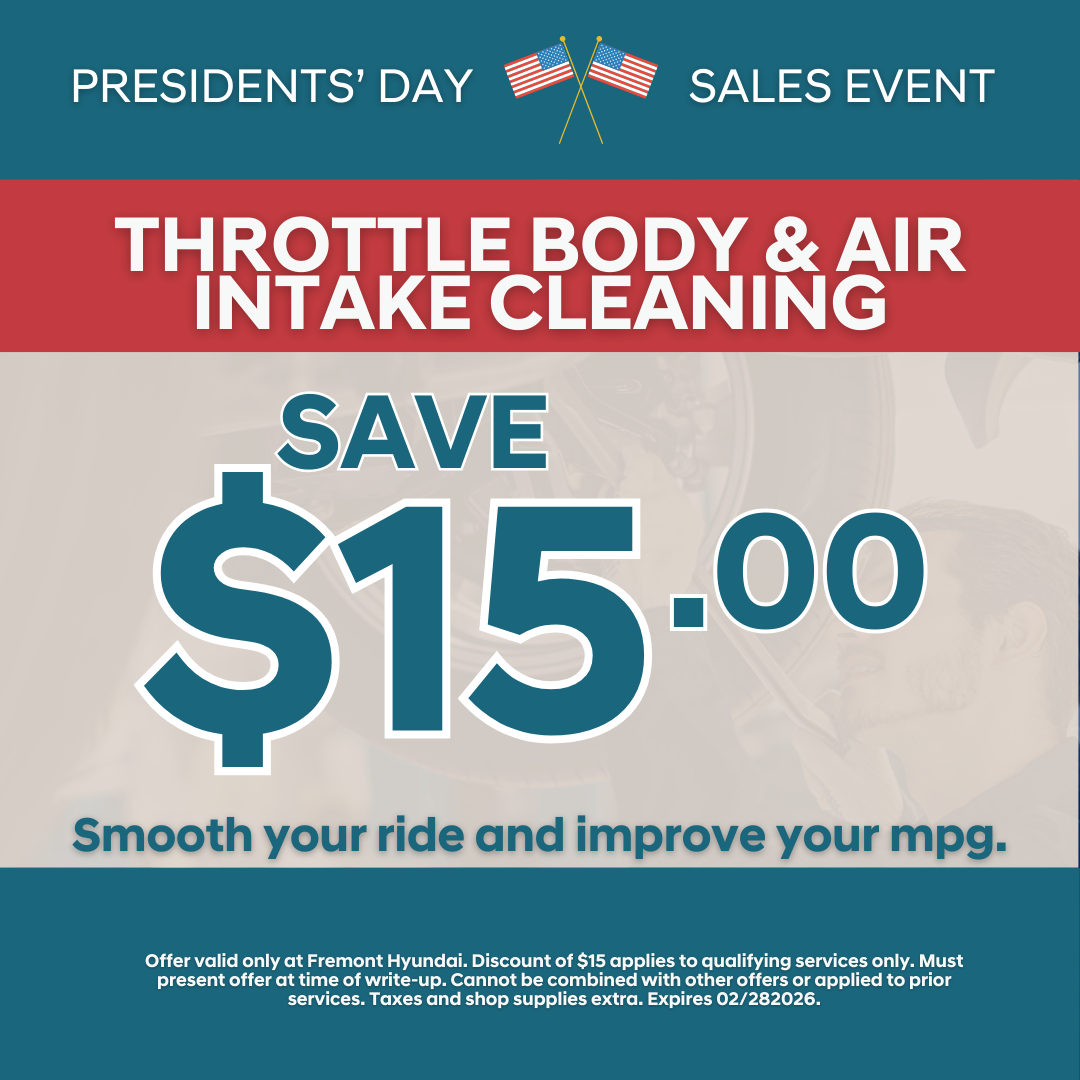 Restore your engine’s breath and performance with $15.00 off a Throttle Body and Air Intake Cleaning Service at Fremont Hyundai. Our specialized cleaning removes carbon deposits and "gunk" from your intake system to eliminate rough idling and sluggish starts.