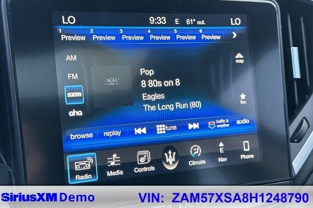 Bianco 2017 Maserati Ghibli RWD ZF 8-Speed Automatic 3.0L V6 NON-SMOKER, Leather Seats, Backup Camera, Bluetooth®, Moonroof, Alloy Wheels, Aluminum Wheels, Light Package, Power Mirror Package, Power Package, Sunroof/Moonroof, 4D Sedan, 3.0L V6, ZF 8-Speed Automatic, RWD, Bianco, Nero w/Leather Upholstery or Full Premium Drilled Leather Upholstery or Full Premium Leather Upholstery or Zegna Edition Upholstery, 4-Wheel Disc Brakes, 8 Speakers, 8-Way Power Heated Front Comfort Seats, ABS brakes, Air Conditioning, Alloy wheels, AM/FM radio, Anti-whiplash front head restraints, Apple CarPlay/Android Auto, Auto-dimming door mirrors, Auto-dimming Rear-View mirror, Automatic temperature control, Brake assist, Bumpers: body-color, Compass, Delay-off headlights, Driver door bin, Driver vanity mirror, Dual front impact airbags, Dual front side impact airbags, Electronic Stability Control, Exterior Parking Camera Rear, Four wheel independent suspension, Front Bucket Seats, Front Center Armrest w/Storage, Front dual zone A/C, Front reading lights, Garage door transmitter, Heated door mirrors, Heated front seats, High intensity discharge headlights: Bi-Xenon, Illuminated entry, Knee airbag, Leather Shift Knob, Leather steering wheel, Leather Upholstery, Low tire pressure warning, Memory seat, Navigation System, Occupant sensing airbag, Outside temperature display, Overhead airbag, Overhead console, Panic alarm, Passenger door bin, Passenger vanity mirror, Power door mirrors, Power driver seat, Power moonroof, Power passenger seat, Power steering, Power windows, Radio data system, Radio: Maserati Touch Control Plus, Rain sensing wipers, Rear fog lights, Rear reading lights, Rear window defroster, Remote keyless entry, Security system, Speed control, Speed-sensing steering, Speed-Sensitive Wipers, Split folding rear seat, Steering wheel memory, Steering wheel mounted audio controls, Tachometer, Telescoping steering wheel, Tilt steering wheel, Traction control, Trip computer, Turn signal indicator mirrors, Variably intermittent wipers, Voltmeter, Wheels: 19" Poseidone Alloy.
