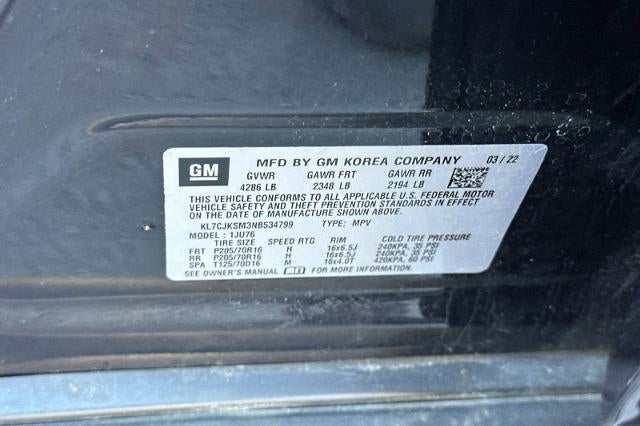 Midnight Blue Metallic 2022 Chevrolet Trax LS FWD 6-Speed Automatic Turbo 1.4L VVT DOHC 4-Cylinder DI SIDI NON-SMOKER, Backup Camera, Bluetooth®, Alloy Wheels, Aluminum Wheels, Light Package, Power Mirror Package, Power Package, Trax LS, 4D Sport Utility, Turbo 1.4L VVT DOHC 4-Cylinder DI SIDI, 6-Speed Automatic, FWD, Midnight Blue Metallic, Jet Black/Light Ash Gray, 16 Aluminum Wheels, 2 USB Ports w/Auxiliary Input Jack, 2-Way Manual Front Passenger Seat Adjuster, 3.53 Final Drive Axle Ratio, 4-Way Manual Driver Seat Adjuster, 6 Speakers, 6-Speaker Audio System Feature, ABS brakes, Air Conditioning, Alloy wheels, AM/FM radio: SiriusXM, Apple CarPlay/Android Auto, Brake assist, Bumpers: body-color, Cloth Seat Trim, Compass, Deep-Tinted Rear Glass Windows & Liftgate, Delay-off headlights, Driver door bin, Driver vanity mirror, Driver's Seat Mounted Armrest, Dual front impact airbags, Dual front side impact airbags, Electronic Automatic Cruise Control, Electronic Stability Control, Emergency communication system: OnStar and Chevrolet connected services capable, Exterior Parking Camera Rear, Front Bucket Seats, Front Bucket Seats w/Driver Power Lumbar, Front License Plate Bracket, Front reading lights, Front wheel independent suspension, Fully automatic headlights, Illuminated entry, Knee airbag, Low tire pressure warning, Occupant sensing airbag, Outside temperature display, Overhead airbag, Panic alarm, Passenger door bin, Passenger vanity mirror, Power door mirrors, Power steering, Power windows, Preferred Equipment Group 1LS, Premium audio system: Chevrolet Infotainment 3, Radio data system, Radio: Chevrolet Infotainment 3 System, Rear seat center armrest, Rear side impact airbag, Rear window defroster, Rear window wiper, Remote keyless entry, Security system, SiriusXM Radio, Split folding rear seat, Spoiler, Steering wheel mounted audio controls, Tachometer, Telescoping steering wheel, Tilt steering wheel, Tint & Cruise Package, Traction control, Trip computer, Variably intermittent wipers.